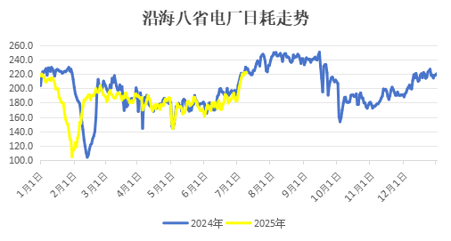 需求端,高溫天氣推高用電負荷,"迎峰度夏"效應正在全面顯現(xiàn)。全國多地進入高溫模式,特別是華東、華南地區(qū)持續(xù)性高溫天氣,迅速拉升居民用電負荷。數(shù)據(jù)顯示,江蘇電網(wǎng)最高負荷達1.27億千瓦,同比增長9.2%;浙江全社會用電負荷創(chuàng)下1.26億千瓦的歷史新高。沿海八省電廠日耗攀升至214-220萬噸水平,電煤消耗保持偏強表現(xiàn)。
